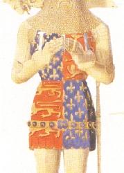 The arming coat of the Black Prince is dated to circa 1376, and was made from blue and red velvet, embroidered with the arms of France and England quarterly. It was padded with wool, lined with satin and quilted vertically.It fastens centre front with lacing through eyelets. The sleeves are torn at elbow level, but were probably full length since only the upper quarters of the coats of arms are preserved on the sleeves.