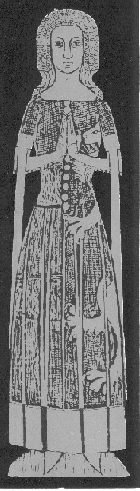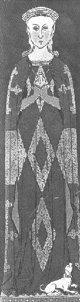 | Lady Maud Foxley, 1378, Bray, Berkshire. She was the first wife of Sir John Foxley, and wears a very heraldic surcote, short-sleeved with tippets. It is probably edged with fur. |