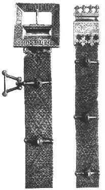 Woven belt with double-sided twill weave in rhomboid pattern of sophisticated technique. Warp in blue, green and red silk with elements of silver thread and red silk. It has a total of 27 struts or stretchers of silver-gilt with a boss in the middle, in which green, red and blue semi-precious stones were set. One of the struts also has a small triangular "stirrup", probably for a bag. In three of the struts, instead of a stone, there is a hole for the tongue of the buckle. The buckle is square, in silver-gilt with a miniscule inscription: help ghot un maria nu altit (God and Mary always be our help). In the middle of one side a crown is engraved, resembling the one on Erik of Pomerania's coins. On the back of the buckle a trademark has been engraved, probably that of the goldsmith, as well as some indistinct initials and roman umbers. The end facings, also in silver-gilt, are decorated with wrought, chiseled and engraved Gothic "crabs" and leaf ornamentation.