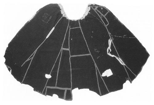 The cloak of St. Birgitta is now in Rome. It was borrowed by Statens Historiska Museum in 1973/4 for an exhibition on 'Birgitta and the Holy Land'. When it was examined closely it turned out to be a garment cut off below the armholes. It has fitchets between the front and side pieces, which marks it as a surcote. The original garment was probably somewhat longer in the back than in the front. It was made from a dark blue fabric, fulled and shorn.