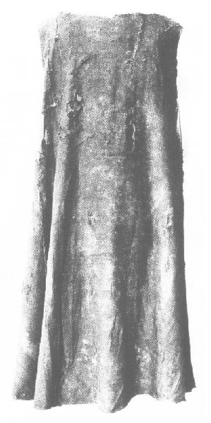This is a man's gown made from a dark brown 2/2 twill which was evenly woven from tightly spun wool. It has a very gradual and large increase in size from the shoulders and down to the hem and would have been quite loose-fitting. Fitchets show that it was an overgarment. The armhole edges are sewn down, which indicates that there were no sleeves.
