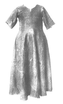 This is a woman's surcote with short sleeves. It is the best preserved dress of the find and was C14-dated to 1413-1449. The owner was a slight woman with a spinal curvature and a hump back. It was made from very firm 2/2 twill. The weft is so well-beaten that the warp is hardly visible.