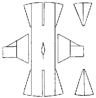 The garment has two gores in the front, two in the back, and two on either side, all of them gathered into the points. The front and back gores appear to have been left split, but as there were no seams preserved you can't tell. The edges were simply sewn down with an overcast stitch.