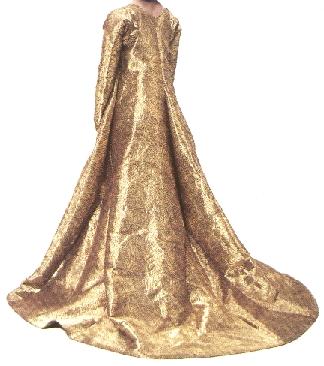 The fabric is a gold brocade on a red silk ground fabric. The design is a framework of laurel garlands with a group of five pomegranates at their points, surrounding a central motif of something that resembles a pineapple. It is generally considered to be of Italian manufacture. The gown will have used around 10 3/4 metres of fabric at the known loom width of 60cm. The careful joining of pieces to make up the main part of the garment was done matching directions in the weave, which will have wasted some of the very expensive fabric. However, some of the inserted gores under the sleeves are of a different fabric, and one of the four main pieces was made up less carefully.