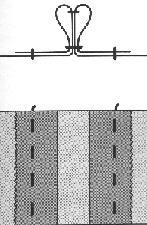 The seam most commonly used is the one seen below to the left. The seam was sewn with a backstitch using double, two-ply S-spun silk, now brown, perhaps originally red. The seam allowance was then flatfelled with a running stitch, except in the waist where they were hemmed down. The side seams in the waist, and the back seam for the top 60-70 cms was reinforced (see below at right). The seams were sewn with a backstitch, then the seam was "taken in" and another row of backstitch sewn through all four layers of fabric, forming a welt. The edges were then flatfelled. These seams were executed with a double linen thread in the back seam. This may have been to take in the seam in the back, but it also serves to 'pad' the gown slightly in the back. The remaining seam allowance in the reinforced seams is approximately 2 cm wide, whereas the ordinary seams have been clipped closely to 0.7-1 cm width.The hemming was very simple, with a 1 cm single fold which was hemmed down with silk.