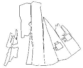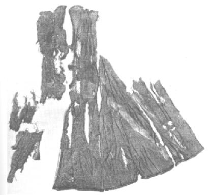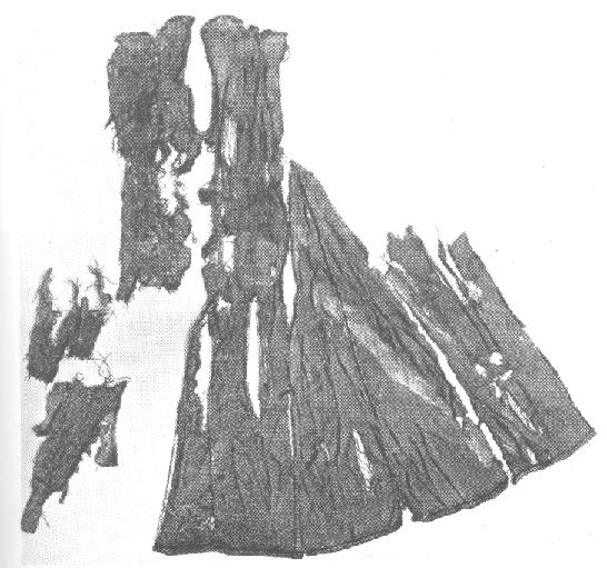 Only about a quarter of the garment remains intact. The cut is similar to the Moselund kirtle, but unlike the other basic kirtles it has a seam up the centre front. Nockert speculates that this may mean that the garment was mi-parti. There has been no dye-analysis on the find to my knowledge to prove or disprove this theory. The fabric density varies slightly in the different pieces, but that means little. The fabric is a 2/2 twill, with a higher weft count than warp count. It is also woven from a darker warp and a lighter weft, similar to many of the Herjolfsnes garments which it also resembles in the cut.
