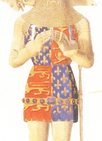 The arming coat of the Black Prince is dated to circa 1376, and was made from blue and red velvet, embroidered with the arms of France and England quarterly. It was padded with wool, lined with satin and quilted vertically.It fastens centre front with lacing through eyelets. The sleeves are torn at elbow level, but were probably full length since only the upper quarters of the coats of arms are preserved on the sleeves.