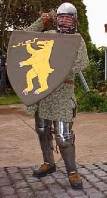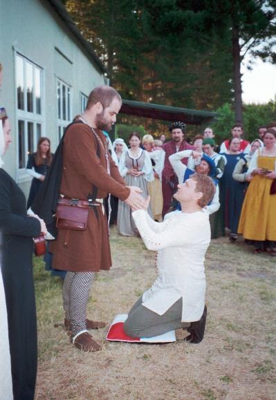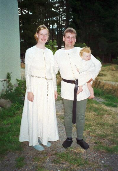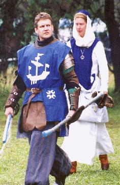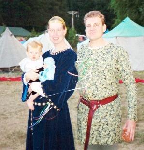 Us at the heraldic tourney at Festival in 1999. Asbjorn is wearing an Ildhafn tabard and the Caidan Cross.
